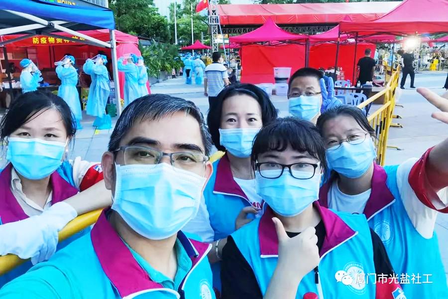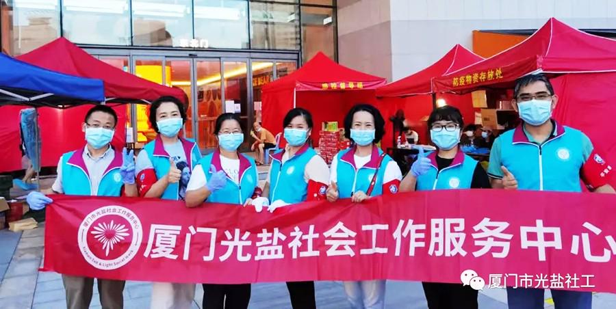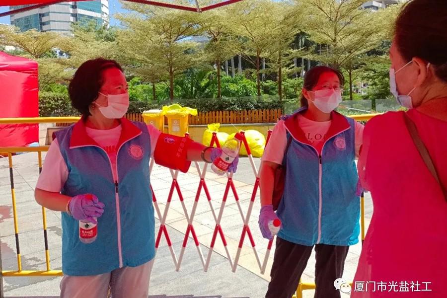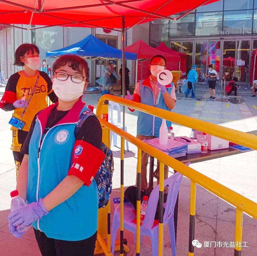 近期以来,福建莆田、厦门等地的疫情牵动着全国人民的心,许多当地的爱心团体也积极加入到这场疫情阻击战中。9月20日,厦门市光盐社会工作服务中心的志愿者们在嘉莲街道莲兴社区核酸检测点,采取多种形式维持秩序,疏导人流,协助社区居民核酸检测工作有序进行。