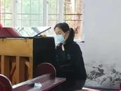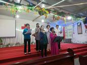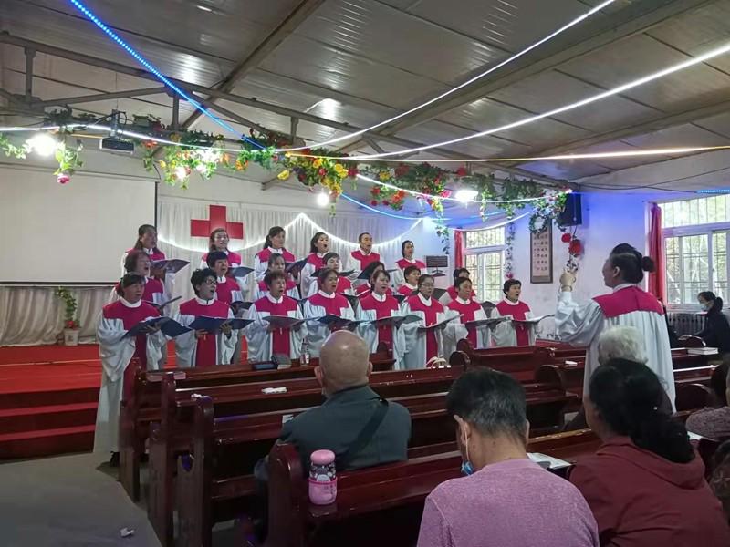 接下来,是教会一诗班登台献唱赞美。二十一位姊妹身着白色圣服,走上前台依次站成三排队列。在优美钢琴音乐伴奏下,在柴姊妹富有艺术性激昂动作指挥下。诗班姊妹们满怀对主的深厚情感,放声献唱了《祂诚然担当》《悔改吧!浪子们》两首赞美诗歌。