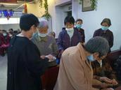 教堂门口的右侧临坡路土台处,几位赞美团契姊妹手捧歌夹正在练唱赞美诗歌。教堂门内,一位年长姊妹在条桌前招呼接待来客。笔者按要求戴好口罩扫二微码、测量体温登记信息后进了过渡堂。直到这个时候终于松了口气,刚才心里怕赶不上聚会的小石头落地了。如果再晚来一会儿,估计是进不来了。