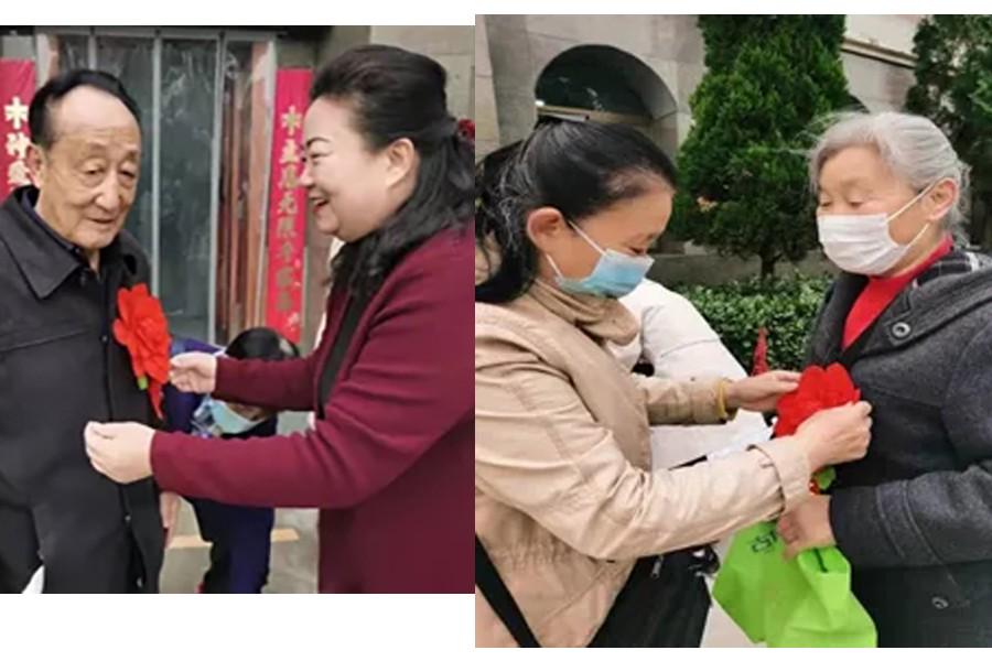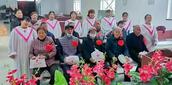 主日崇拜的清晨,虽然气温骤降,天气格外寒冷,老人们依然如约而至。各点的同工们为老人们戴上了大红花,城区堂大院内,闫美玲长老、王红才执事、于慈爱执事、郭小俊执事、李小平执事,早早地预备在教堂门口,迎接前来聚会的主内家人们。他们一一地为每一位七十岁以上的老人肢体佩带红花,送上节日的祝福与礼物。