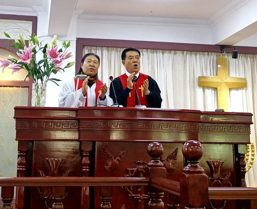史爱军主席证道结束后,与鞍山市基督教协会会长、本堂袁明牧师一起,首先为主献上感恩的赞美,而后,赞美会在圣灵充满中开始。