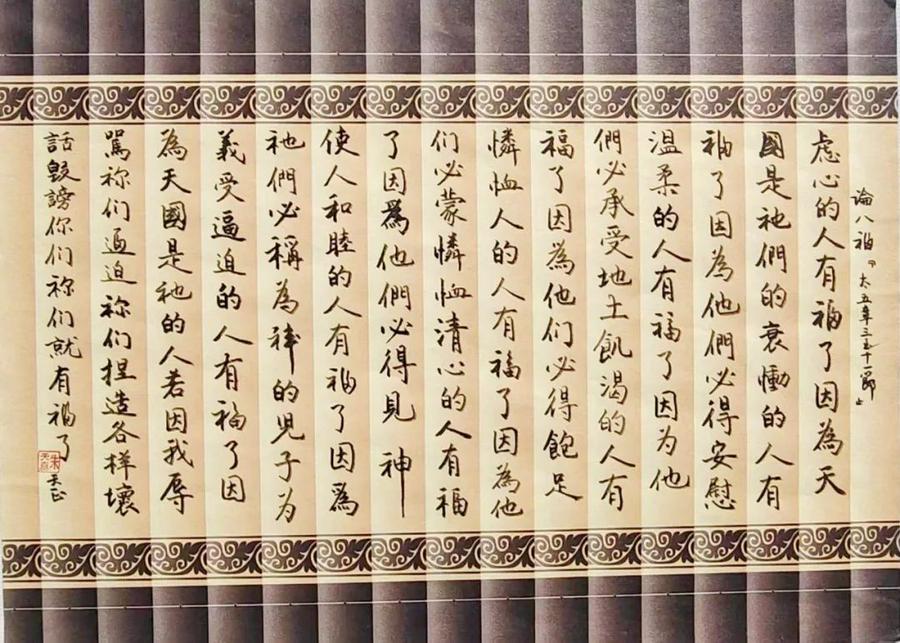 书法是一门非常古老的汉字书写艺术,被誉为“无言的诗,无形的舞;无图的画,无声的乐”,其艺术魅力不言自明,优秀传统文化的地位毋庸置疑,此次以方块字书写基督教信仰的尝试,不仅激发了广大信徒对书法的兴趣,丰富了教会的信仰生活,更增强了广大信徒的“四个自信”“四个意识”,是基督教中国化的一次有益探索。