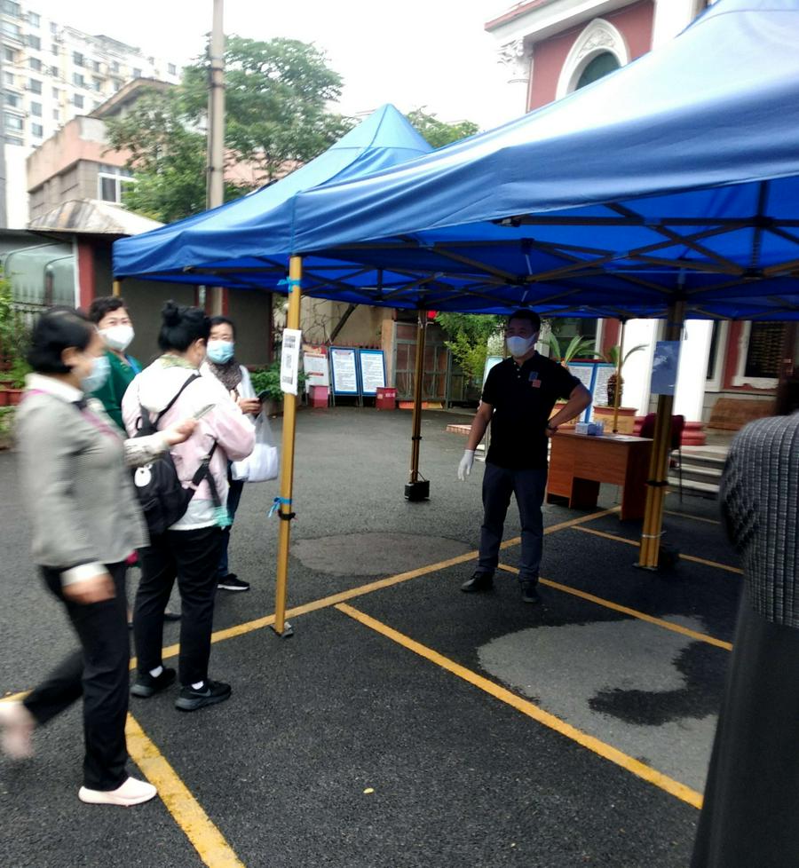 四是教会的教牧同工,包括各堂的主任牧师、长老等都在教堂的正门亲临一线,迎候肢体前来聚会,并协助服务同工帮助走防疫流程。有的教会负责人耐心地帮助老年肢体用手机扫码登记、有的教会同工告诉手机没有流量的信徒如何使用教会的公用网络上网登记。教会的服务同工很是辛苦,路远的有的早晨五点多钟没有吃早饭就出发来到教堂参加服事。而且他们要在仲夏炽热的“一线”露天服务一天到晚。
