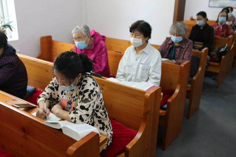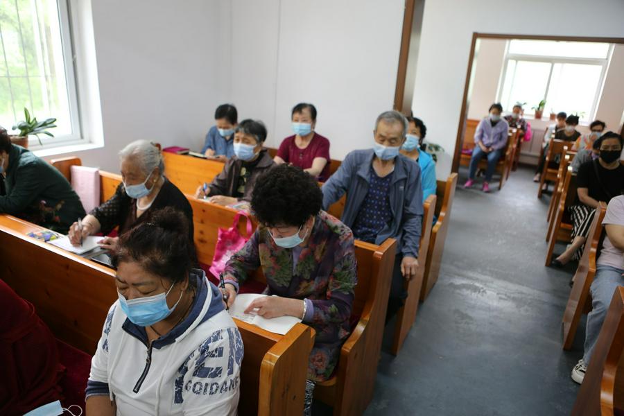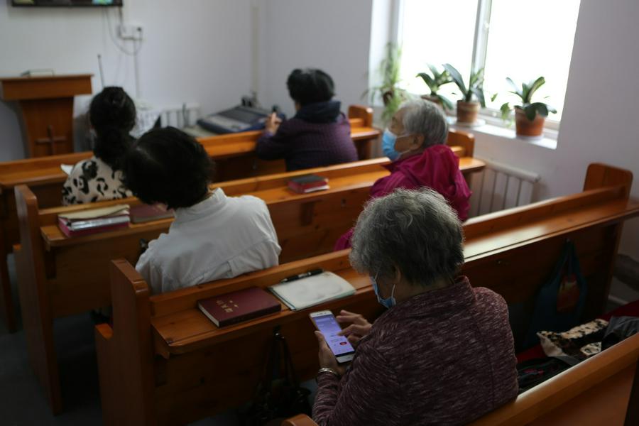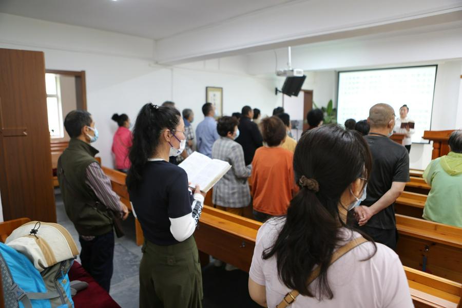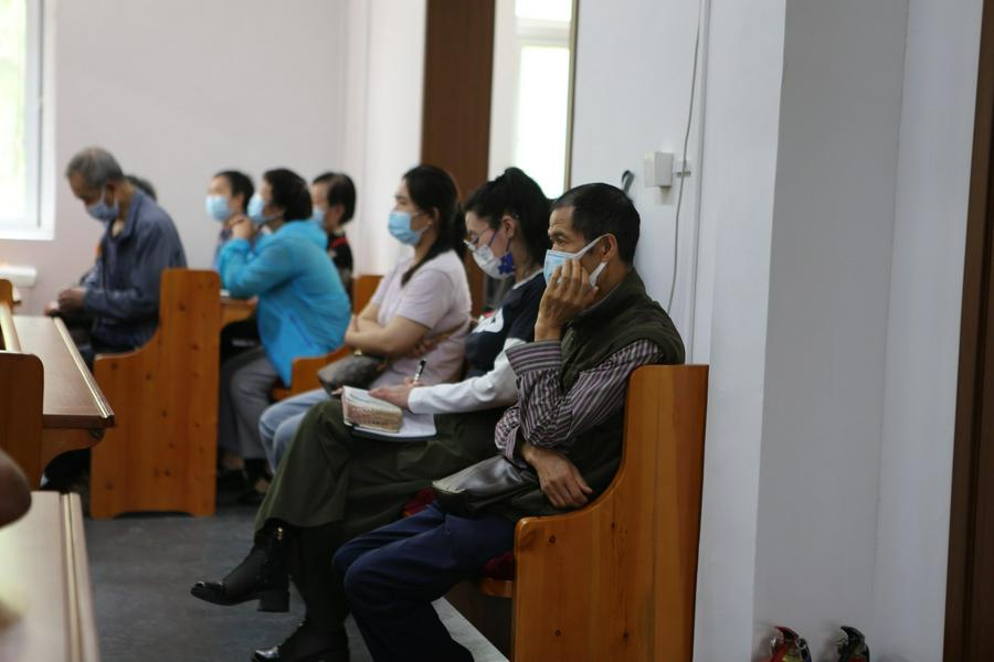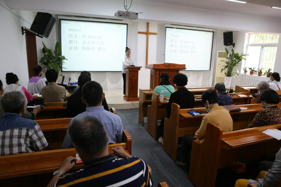 在教堂正门,前来聚会的弟兄姊妹们陆续的接受了“辽事通”等“三码”验证后,按照常态化防疫要求进入主堂和各个副堂就坐,在诗班带领下共同唱赞美诗。今天由杨振春教士以《圣灵的工作》为题为主证道,他与会众诵读圣经新约约翰福音16章4至15节,分享了圣灵的工作。