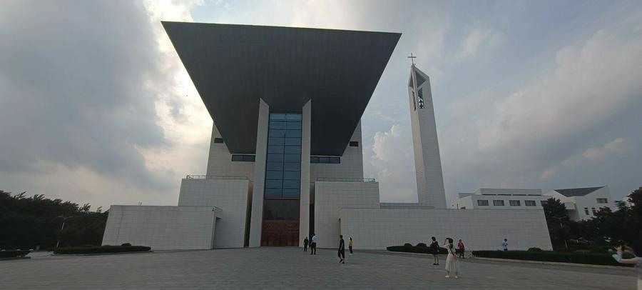 最后我们来到了礼拜堂前,塔楼上高耸如云的十字架,与宏伟庄严的礼拜堂相互映衬,使人在蓝天白云间仰望神的伟大慈爱和圣洁。