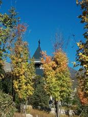 又不知何时路过草原时,被古崖居前有座新教堂抢走眼了。教堂黑灰尖顶,乳白色的墙体,细长五彩的玻璃窗,高高的钟楼上矗立着十字架,显得静瑟端庄。