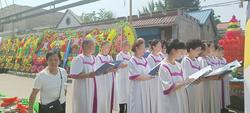 哀乐低回,花圈簇拥,中间蓝色气拱门上的“信耶稣上天堂”以及上方追思礼拜的十字架格外引人注目。一大早,教会圣乐队身着西服领带,敲起了锣鼓,吹起洋号,声震四野。接着他们表演快板、三句半、独唱、小舞蹈等节目,内容多以倡导家庭和睦、孝敬父母、 促进和谐等方面内容,表演者都是村里的弟兄姊妹,方言土语诙谐幽默,很接地气,在潜移默化中使人认识了基督教信仰,传扬了福音。