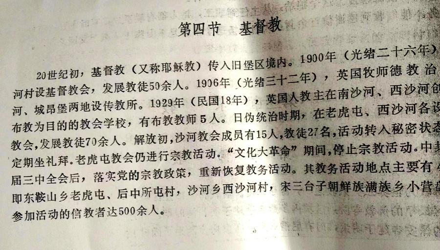 我提出了要查阅《旧堡区志》(千山区原名叫做旧堡区)或区《宗教志》,因为地方志往往会记载当地宗教的历史沿革和情况,这是具有代表性和权威性的地方历史,一般来说除了地方志如市志、县志等外,还会有当地的《宗教志》,是专门记录当地各个宗教历史的。档案馆的同志告诉我,他们区没有《宗教志》。经过请示之后,给我找出了最早版本的区志。很快,我在基督教栏目中找到了大约关于全区基督教仅仅寥寥百余字的记载,其中提到了老虎屯教会: