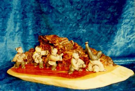 我从大叔的手艺中认识根雕与木雕一脉相承,但木雕不受材形局限,而根雕用料比木雕更天然,也需更独特的文化底蕴。若无基本的文化底蕴、独到的审美眼光甚至丰富的想象力,无法为他人解读树根的另一种面貌,这眼光也是何汉文与众不同的才华。何汉文终生未娶,一生简朴,淡泊名利。精准的雕刻技术使得他性格认真负责、热情执着、守正不阿。他喜欢孩子,也具有儿童世界里的真我情趣,他好奇好动的性格更获很多孩子的喜爱。