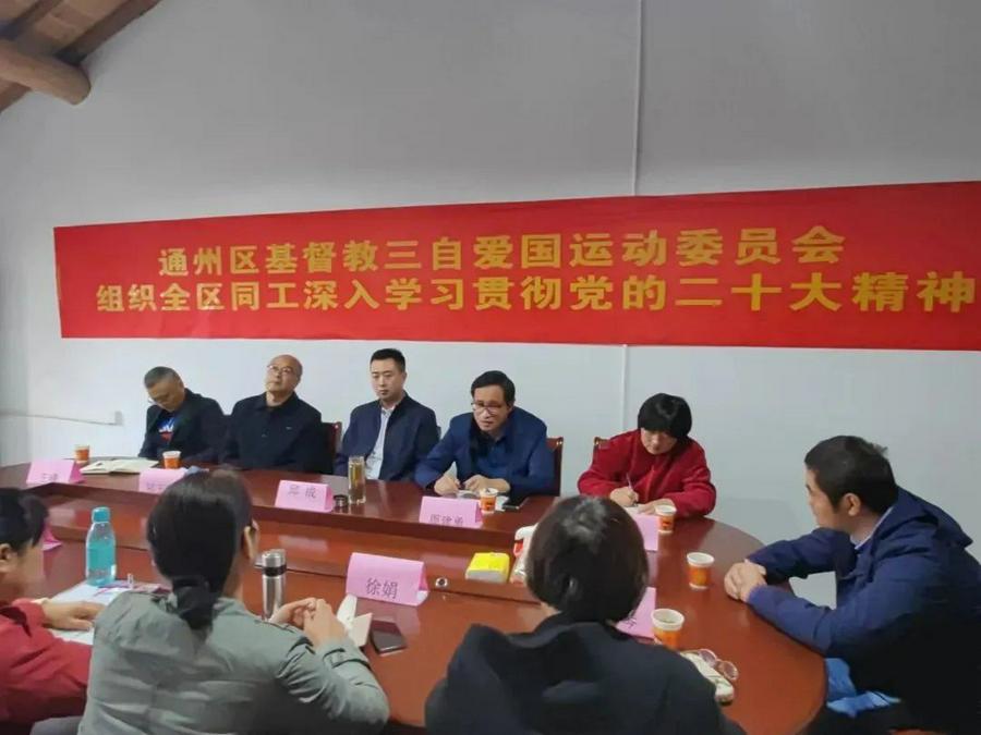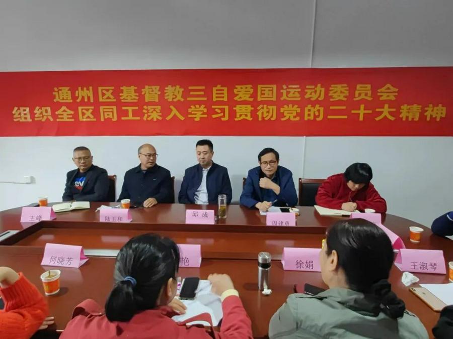 为深入学习贯彻党的二十大精神,11月10日,江苏省南通市通州区基督教三自爱国运动委员会组织召开贯彻党的二十大精神座谈会,会议由区基督教三自主席邱成牧师主持,区民宗局科长周建勇,市基督教三自爱国运动委员会副主席兼秘书长陆玉和牧师应邀出席会议。