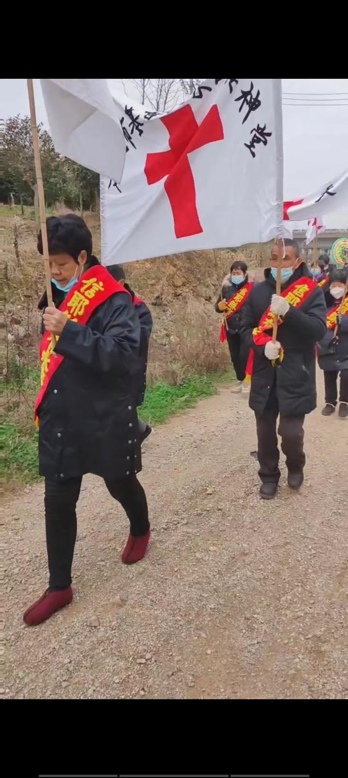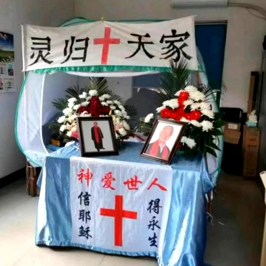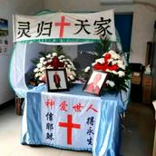 袁相中长老追思礼拜于2023年1月20日下午2:30开始。袁长老追悼大会在他生前居住的教堂小广场举行。追思会会场庄严肃穆,红色十字架两边白底黑字横幅:“灵归天家”,两个带有十字架的花环上安放着袁长老彩色遗像,他的遗体安放在鲜花丛中,遗体上覆盖着象征着信仰和救恩的红十字架白色善单。