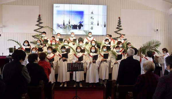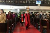 崇拜前,盛恩慈老师向会众做了“棕枝主日及相关圣礼属灵意义”的短宣。随后,在轻柔的殿乐声中,主礼、证道及诗班成员手持棕榈枝列队缓步入场,沈蔚华长老身着红色圣披,高举十字架走在队伍的最前方。红色代表基督的受难,十架代表他的得胜。全体会众同声启应“和散那,奉主名来的是应该称颂的。”现场氛围热烈又庄严。