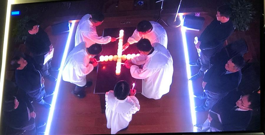晚上七点,礼拜正式开始。在庄严肃穆的钢琴声中,四位同工身着白色礼袍走上圣台,点亮台上摆放为十字架状的蜡烛。烛光亮起,主礼人以马可福音带领众人启应读经,“主耶稣基督曾教训门徒说,‘若有人要跟从我,就当舍己,背起他的十字架,来跟从我。’”