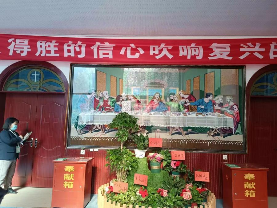 拾阶而上进入门厅,“以得胜的信心吹响复兴的号角”大红横幅宣示侍奉异象,巨大的达芬奇的名画《最后的晚餐》的挂毯映入眼帘,栩栩如生的人物各具情态。特别是耶稣慈爱的神情,在绿植鲜花映衬下,更显庄严肃穆,令人心生敬畏。“主复活了”的字样点明主题。