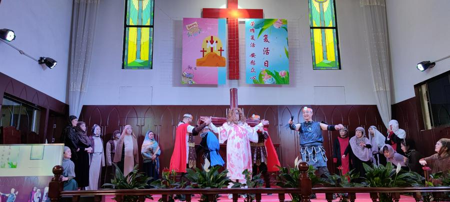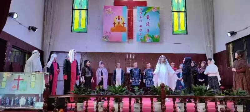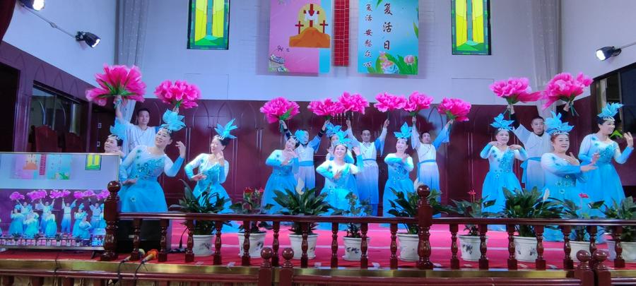 此后诗班的姊妹们表演了舞蹈《荣耀颂》《天耀中华》,翩翩舞姿飞,举手投足间表达了爱神爱国之情;一曲《奇异恩典》响彻全场,在歌声中大家深切品味上帝的奇妙大爱,不少人流下了感恩的热泪;圣剧组表演的精心排练的《耶稣受难》,生动再现耶稣当年被捕、受审、受羞辱、被钉十架、复活的情景,人们屏息观看,时而心情凝重,时而悲痛唏嘘不已,最后耶稣复活时达到高潮,大家一起欢呼鼓掌,无不沉浸在欢呼喜乐的热烈气氛中。