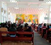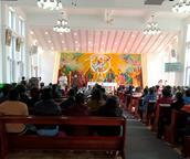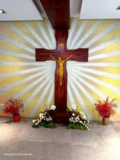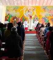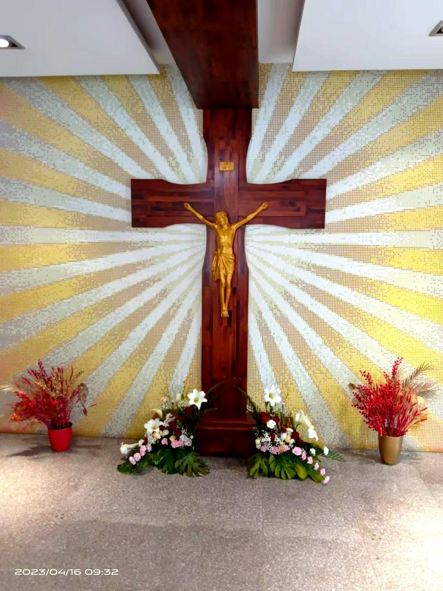 来到教堂,一楼的一位值班的姊妹很是热情,引导我来到二楼的主堂。这里的圣台正面是彩绘的主耶稣基督和祂的十二位门徒的巨幅画像,台下座无虚席,坐满了参加弥撒的信友。这是复活期第二周,神父带领众信友恭读圣马尔谷福音(马可福音)的经文,众人跟随神父做回应。虽然我没有自始至终参加整个弥撒,但已经感到了这种庄严的仪式感,圣神(圣灵)充满。