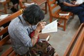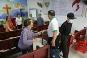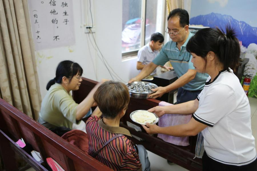 今天是他们的圣餐礼拜,信徒们很重视,虽然是下雨,但也不能阻挡他们从村子的四面八方来圣殿朝拜的脚步。其中年龄最大的九十岁的老弟兄开着电动车携老妻子来到教堂,还有年近九旬的老姊妹拄着四个“腿”的手杖也来到这里。大家在这里读经、祷告、唱诗赞美,感谢主基督的救赎的恩典,充满圣灵的感动。今天的圣餐礼人数不多,但规格很高:北海市基督教三自爱国运动委员会主席陈考思长老司琴、北海市基督教协会会长张业忠牧师主礼。