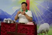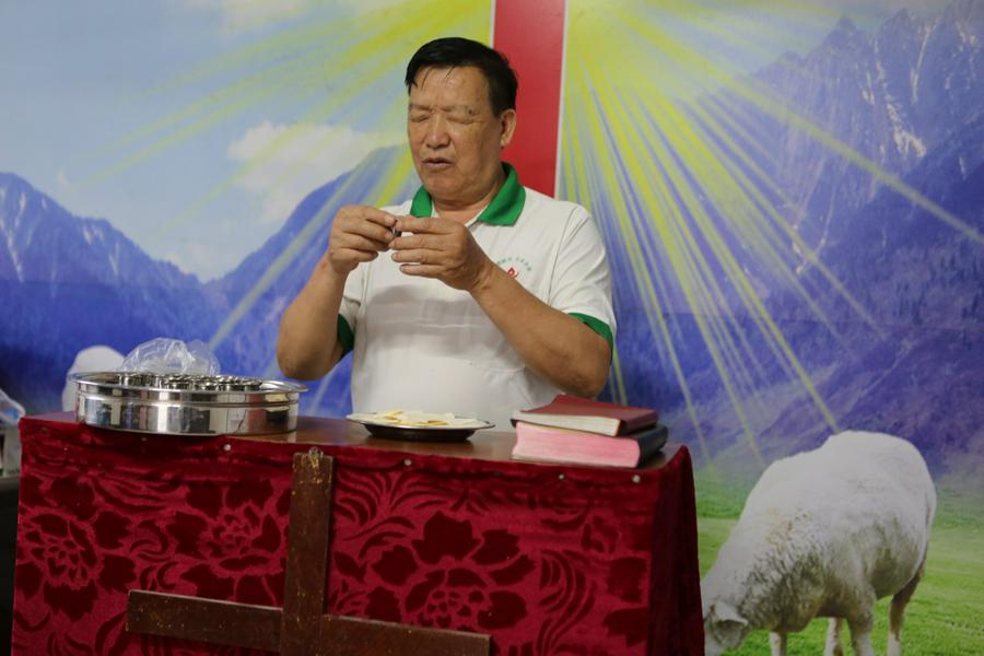 在读经和赞美、祷告之后,张业忠牧师将圣餐分派给服事的同工,信徒们起立领受、服圣餐,与主基督联合。