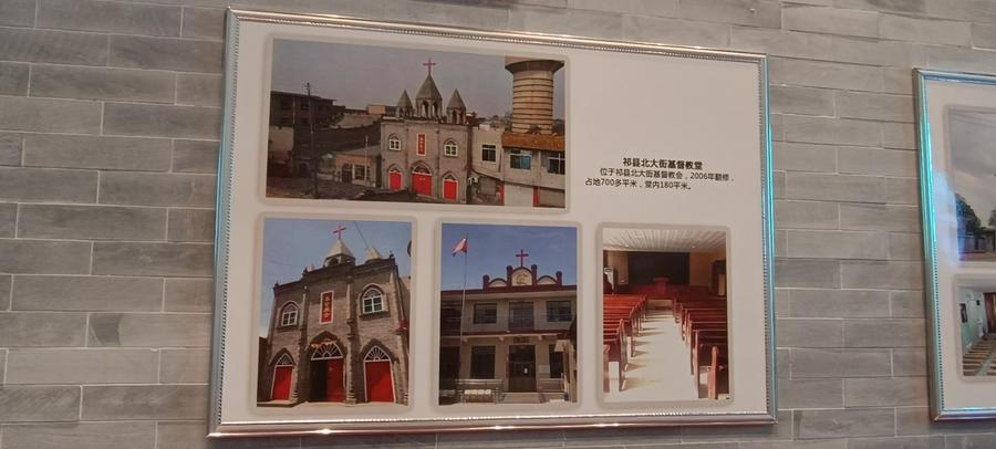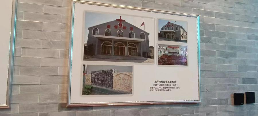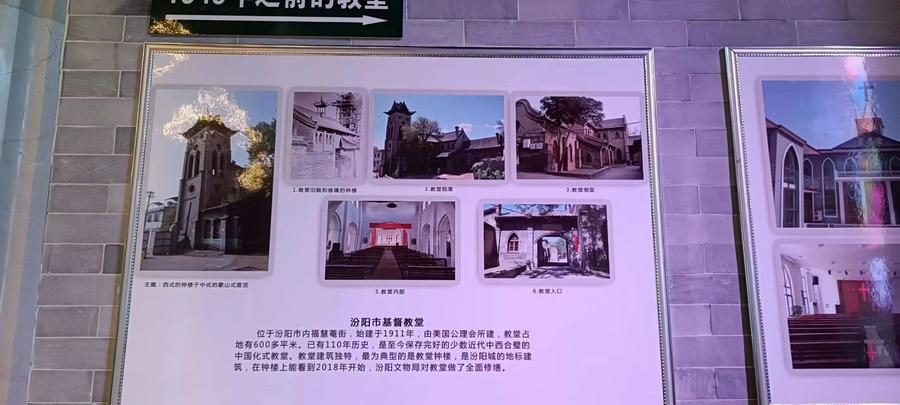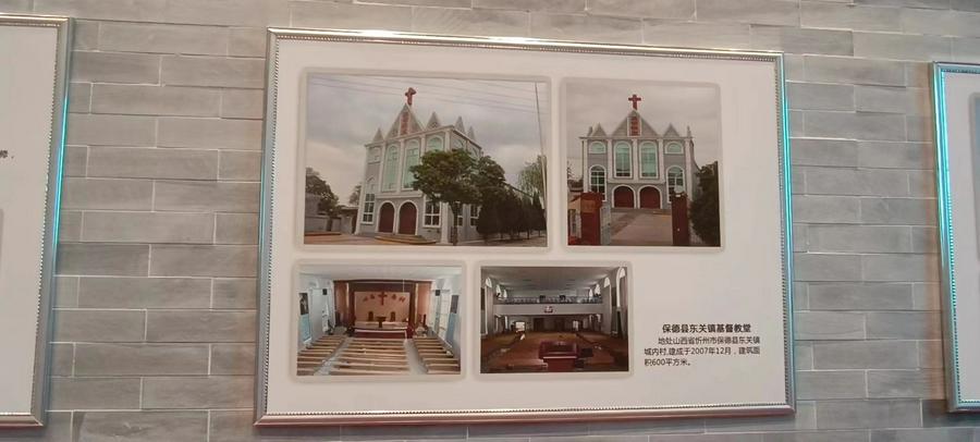 富有特色的是,教堂里面有省基督教两会精心设计的山西省基督教堂建筑图片展,展示了1949年前、1950年至2000年、2001年至2013年、2014年至2021年四个不同时期的68座教堂图片,采取原貌与现状对比的形式,生动再现了山西基督教的发展历程。这成为人们了解三晋基督教文化的窗口,也成为基督教中国化不断走深走实的生动体现。