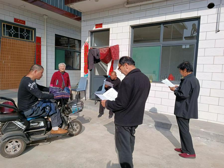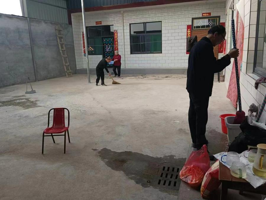 团契的弟兄姊妹稍坐片刻,就开始行动起来,和村里教会的负责姊妹一起帮他打扫卫生。长老执事带头,有的打扫拖地,有的洗涮擦洗,还把院里的下垂的废铁丝清理干净,不一会儿,就收拾得干干净净,令人心里清爽了不少。