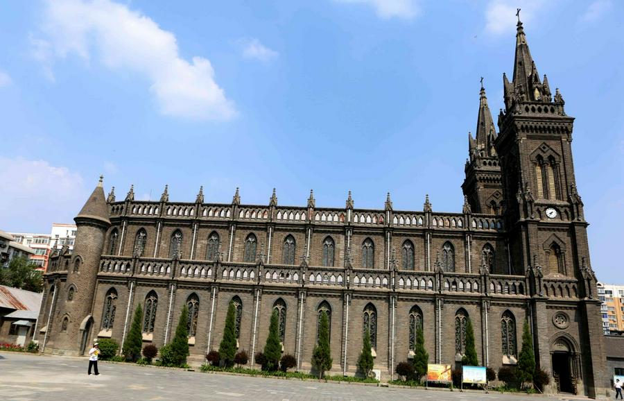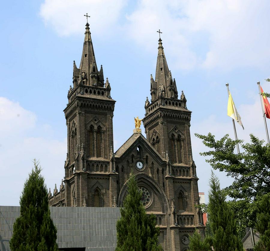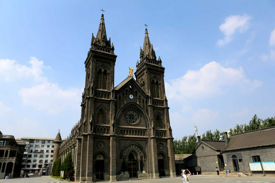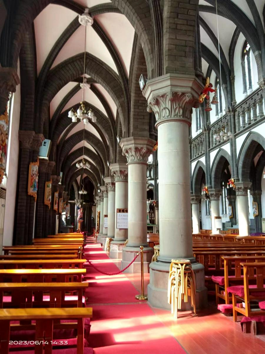 1909年用庚子赔款重建教堂,1912年(民国元年)由法国巴黎大学毕业的梁亨利神父设计,法籍主教苏斐理斯主持在原址重建教堂(即现在的教堂)。教堂南北长66.30米,东西宽17.20米,面积1140.36平方米,可容纳1500人,钟楼高40米,为砖石结构。