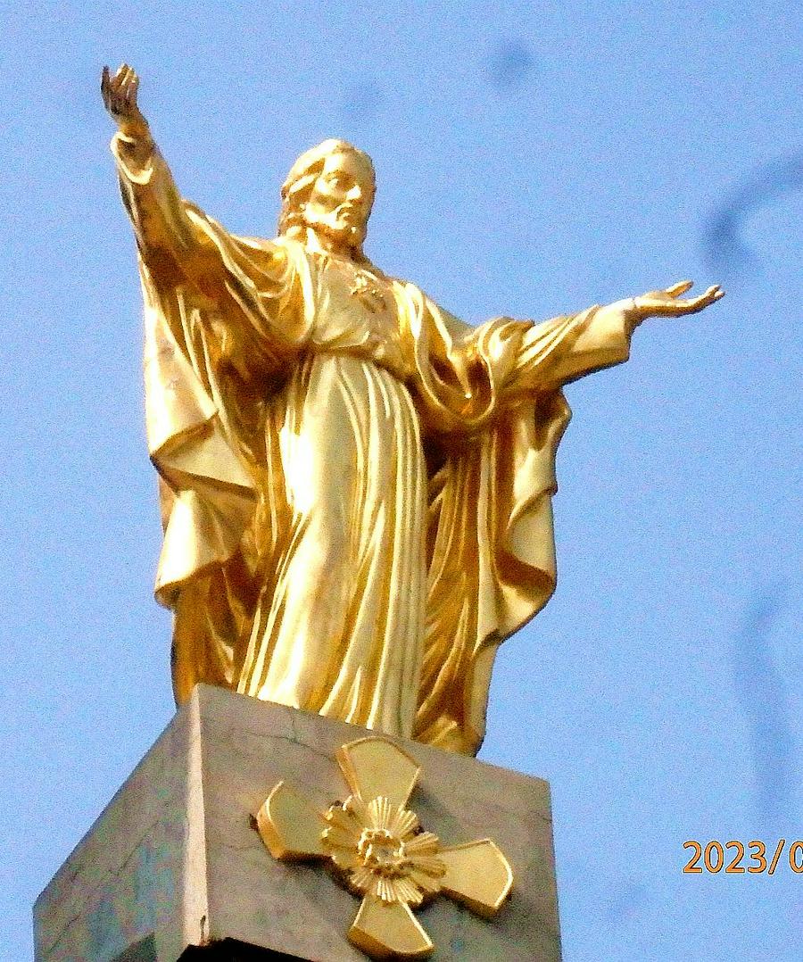 教堂最上方两座尖顶建筑正中央是金碧辉煌的主耶稣基督的雕像,蓝色的天空中,雕像站在金色的十字架上,举起慈爱的手面向世界、面向世人,居高临下、栩栩如生,体现了主耶稣基督的救恩、祝福和圣子真神的尊严。