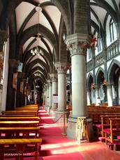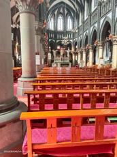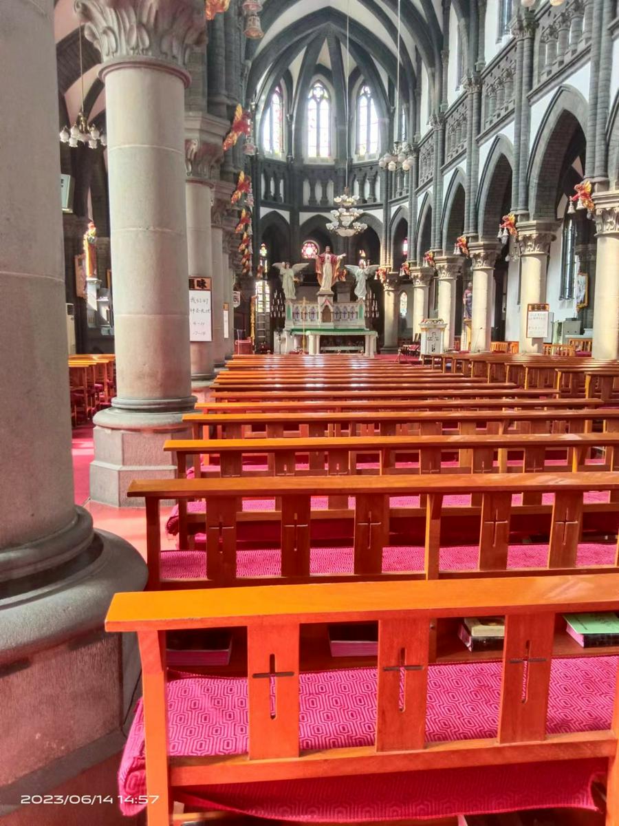 在圣教堂里,最前方是彩色的主耶稣基督和天使的塑像,即耶稣圣心像,这是南关堂的主保,耶稣把圣心展现给世界,献给了人类,体现的就是一个字“爱”。耶稣圣心像的两侧是天使塑像,所谓天使就是天主的使者(善和爱的天使),我们每个人都有天使的保护,不仅保护我们,也保护每一位来观者。教堂内高大的柱子和穹顶,显示出教堂的深邃和庄严,左侧边祭台上的圣母像和右上的约瑟像,也叫做圣母祭台和约瑟祭,这是因为耶稣有两性,神性和人性,因为玛利亚是耶稣的母亲,耶稣是天主,所以说玛利亚是天主的母亲,为此天主教格外的敬礼玛利亚。不是以神的姿态恭敬她,而是敬礼,是有一定道理的。