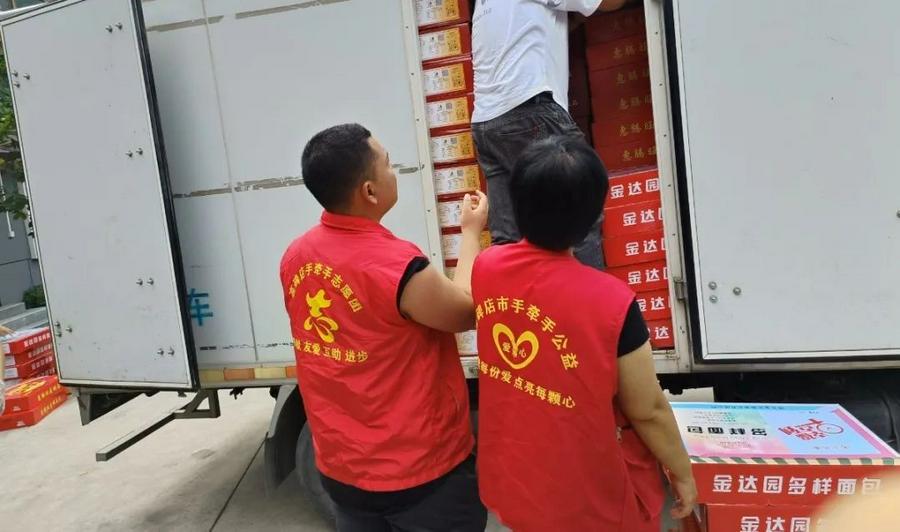 8月2日下午,包括面包243箱、水120件、榨菜6箱、方便面60箱在内的爱德驰援物资送达高碑店市下辖乡镇的多个安置点。
