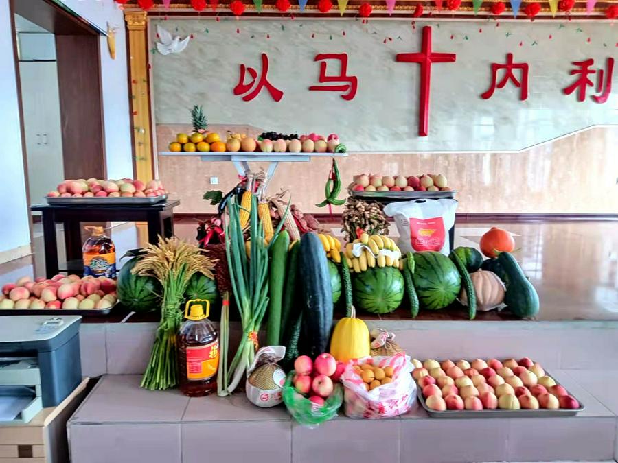 今天的达牛教会,充满着欢庆、喜乐的氛围。在圣殿圣台的前面,摆放着信徒奉献给神的蔬菜、水果、粮食、米、面、油等象征丰收的祭物,大家用丰收的果实和欢笑来庆祝这个节日,赞美伟大的神,收成归天家、收成荣耀神、收成是神赐予,感恩之情溢于言表,载歌载舞表达心愿。