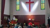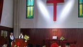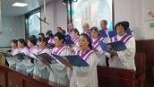 九时三十分,感恩崇拜在七响悠长的钟声拉开帷幕。伴着殿乐,会众静默肃立。诗班身着洁白圣衣列队缓步进堂,参加主礼的牧长及传道手持洁白的素菊随后,依次放在圣台前。