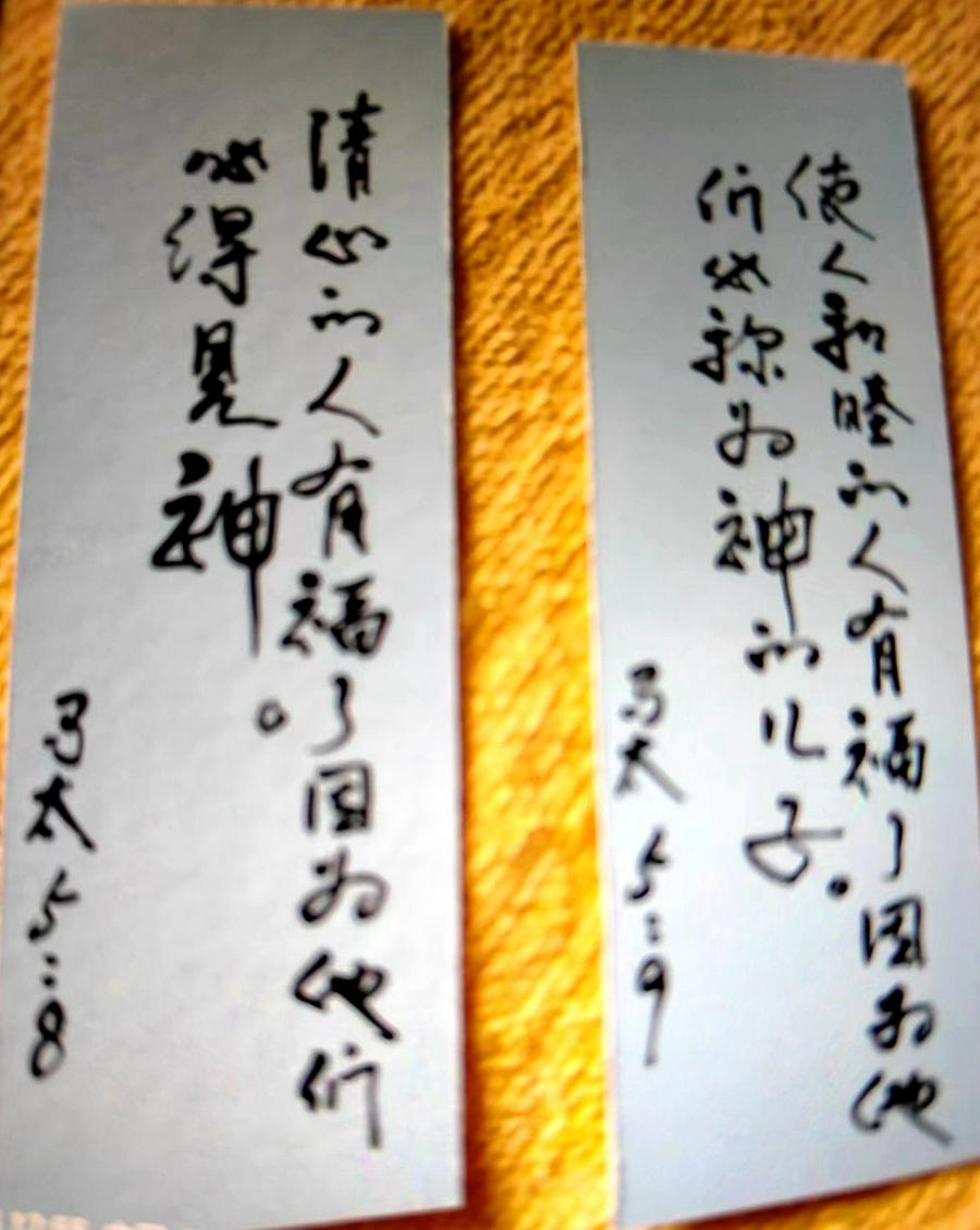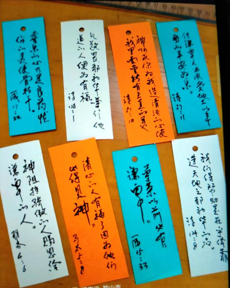 苏姊妹还坚持将读经与练习中国传统文化的书法相结合。她的书法笔精墨妙、流畅行云,是自己的独创体。她书写的圣经金句书法作品和书签更是作为教会赠送给嘉宾的礼物,有的还附在教堂为信徒预备的圣经当中,很受主内同工的喜爱,有一定的名气。