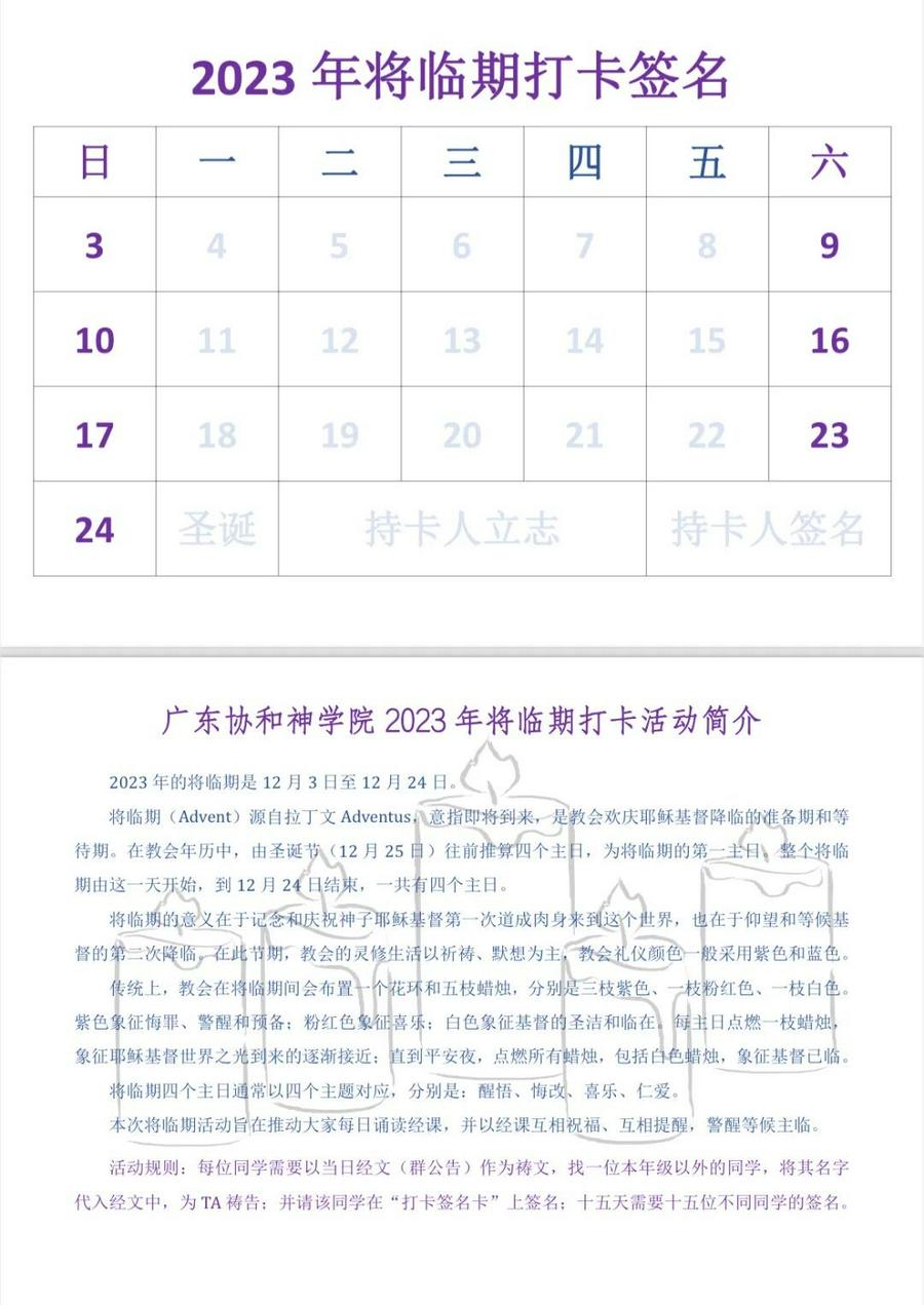 为了推动同学们每日诵读经课,并以经课互相祝福、互相提醒,警醒等候主临,学生会将举行“2023年将临期打卡活动”。