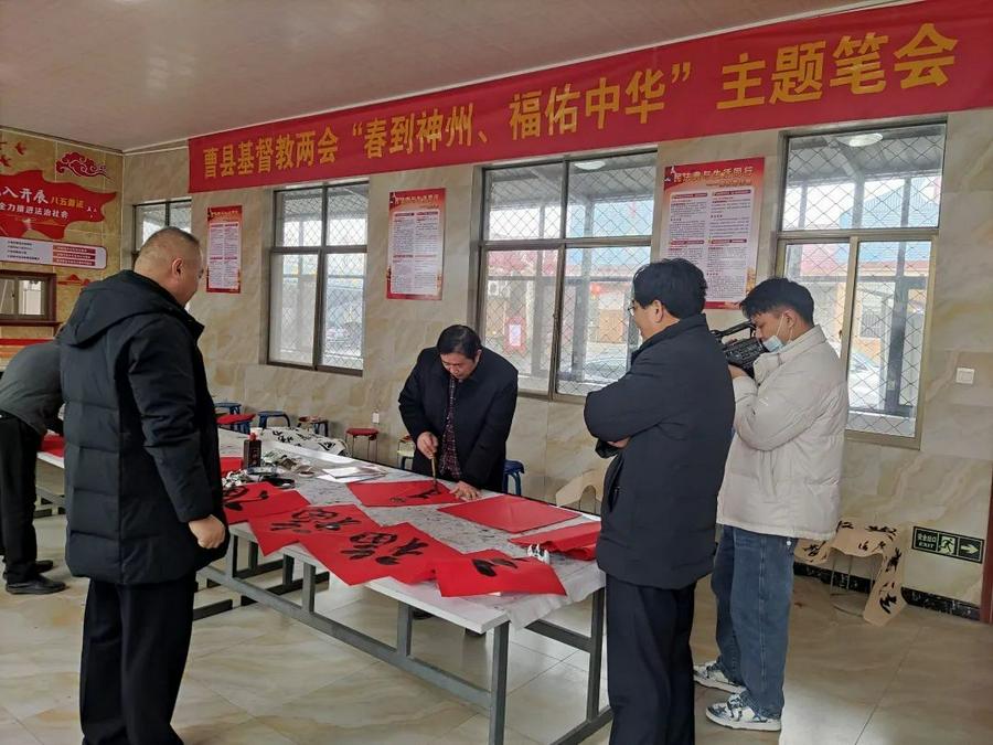 为弘扬中华优秀传统文化,坚持我国宗教中国化方向,积极探索菏泽市曹县基督教实践路径,2024年1月18日,山东省菏泽市曹县基督教两会举办“春到神州、福佑中华”主题笔会,特别邀请中国书法家协会会员、曹县书法协会常务副主席徐广征老师,曹县书法协会副主席王耀真老师,曹县书法协会副主席方广运老师,曹县收藏家协会会长孙涛老师等五位著名书法家参加本次活动。