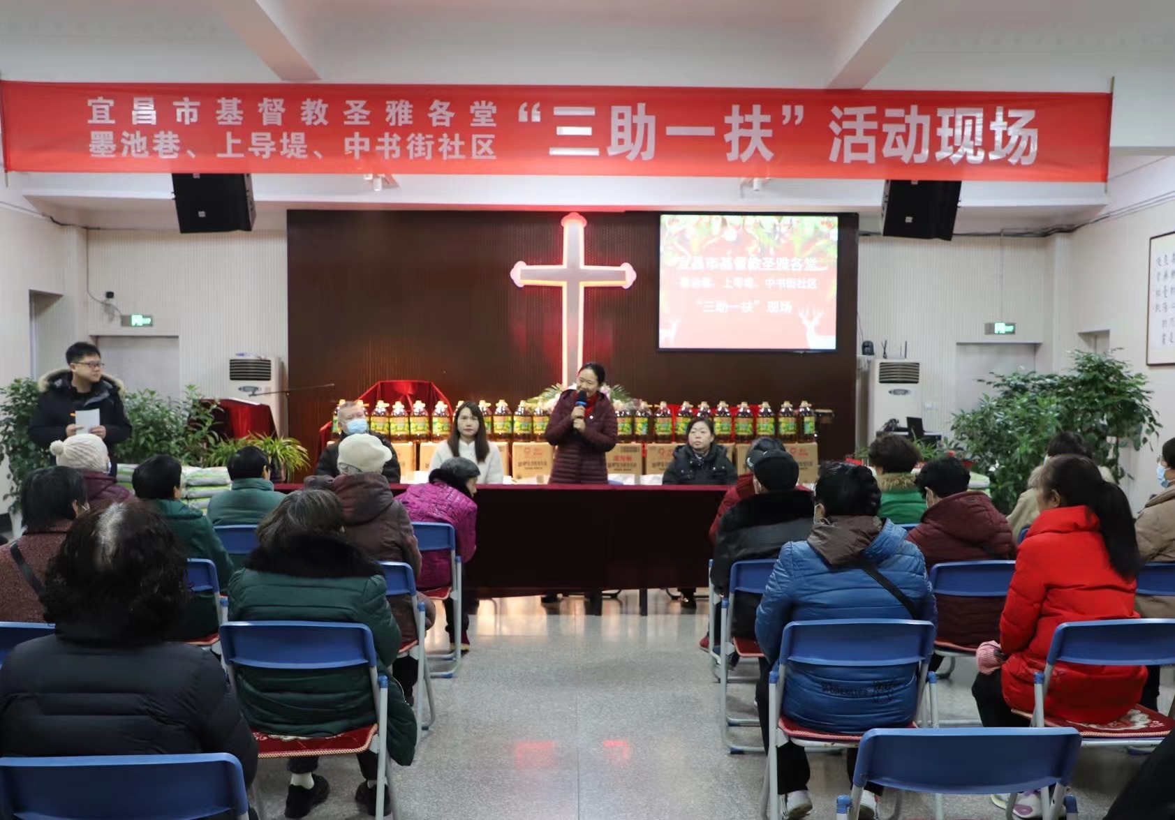 2024年1月31号上午,宜昌市基督教圣雅各堂和墨池巷、上导堤、中书街社区举办三助一扶活动,为120户贫困家庭,购买价值近二万左右的米和油。该堂同工精心策划今年的扶贫活动,提前半个月开会商议,确定扶助方案和物资,和社区电话联系落实相关需要帮助的人,确保让这些爱心物资能送到那些有需要的人手上,对于因身体原因不能来的人,牧者和同工亲自开车将米和油送到家中。