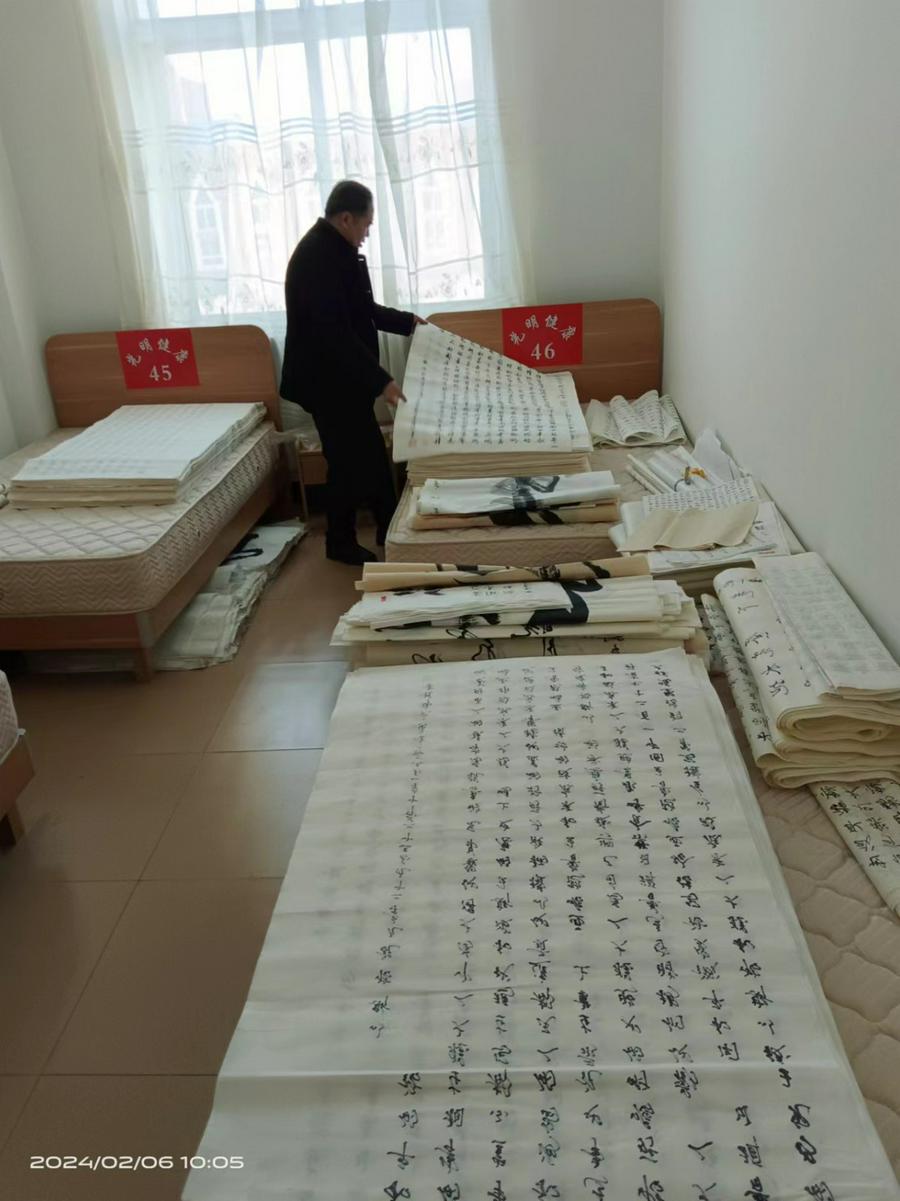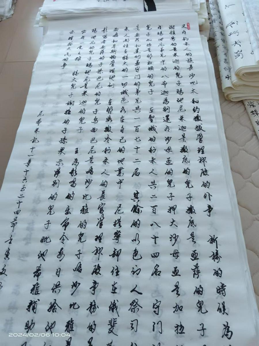 在2023年圣经日前夕,辽宁省沈阳市辽中区教会的王绵礼弟兄终于完成了他的大作——用毛笔抄写整本《圣经》。整个抄写过程费时三年,一千余天,每天坚持抄写8章圣经;与众不同的是用大幅宣纸、挥毫泼墨,以中国传统的书法形式恭抄,共书写了3,100多页;因为是用毛笔书法,每抄写一章圣经大约需要一个小时;恭抄后的圣经没有一篇有错别字或涂改。