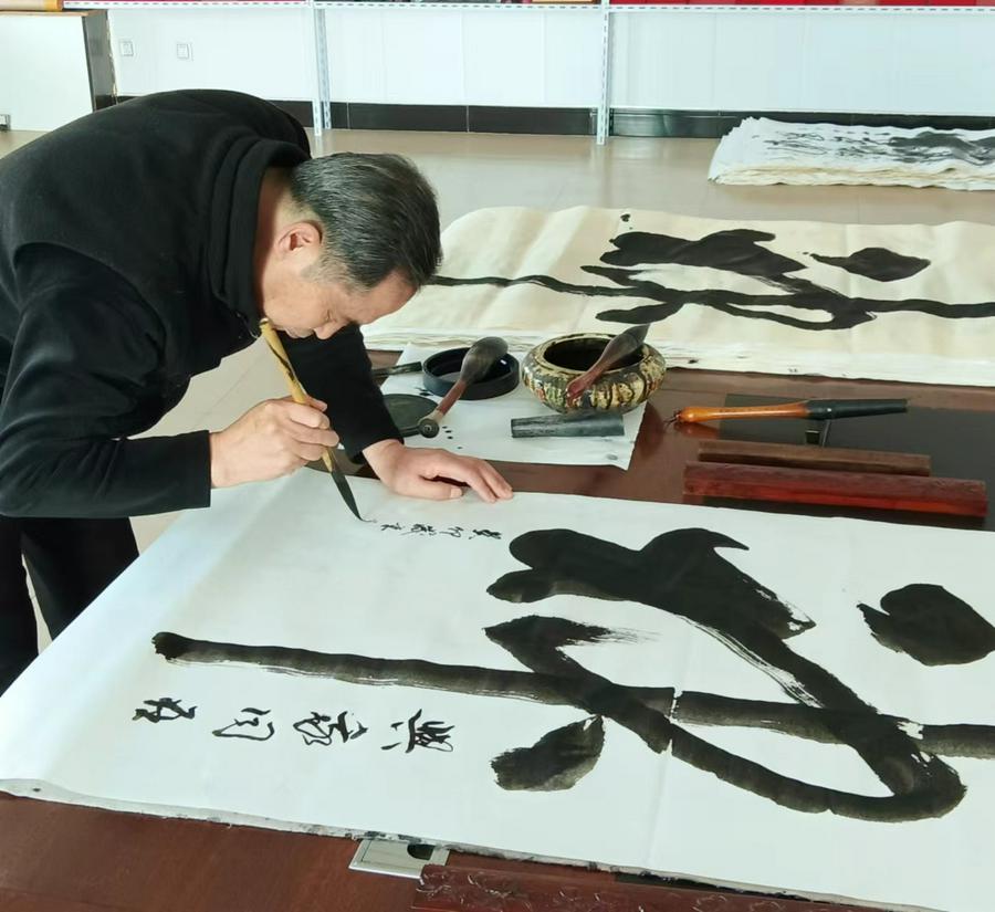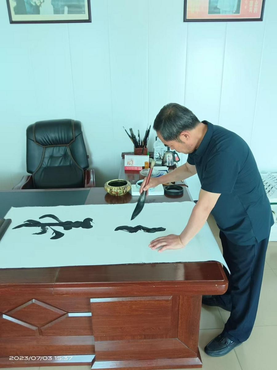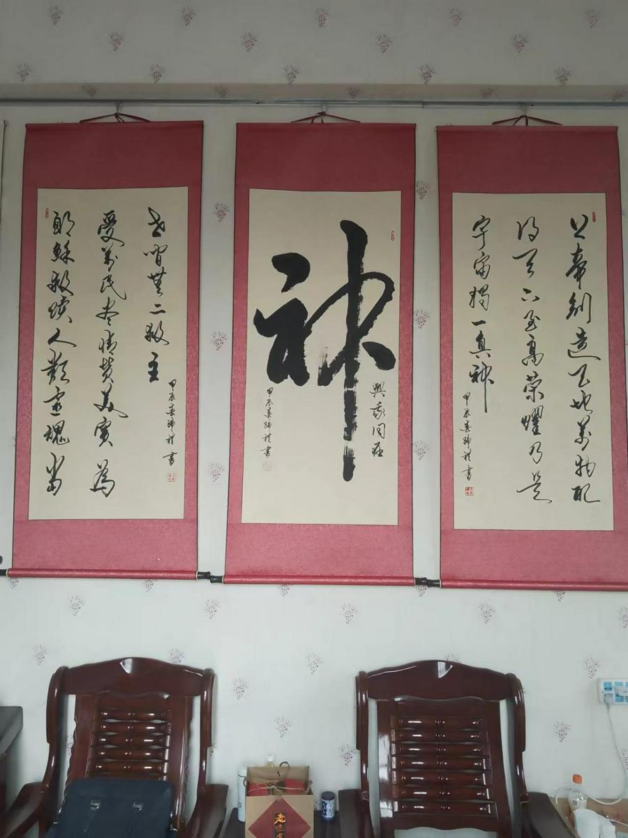 最近,他又有新的作品:以中国传统的“中堂”形式创作了以一幅大的“神”字书法居中,两侧各有同样大尺寸的、由他自创的信仰书法条幅,共计三幅字,以供在教堂的办公室、信徒家中等悬挂,也是带有信仰、文雅、价值的馈赠礼品,可以彰显信仰、广传福音。
