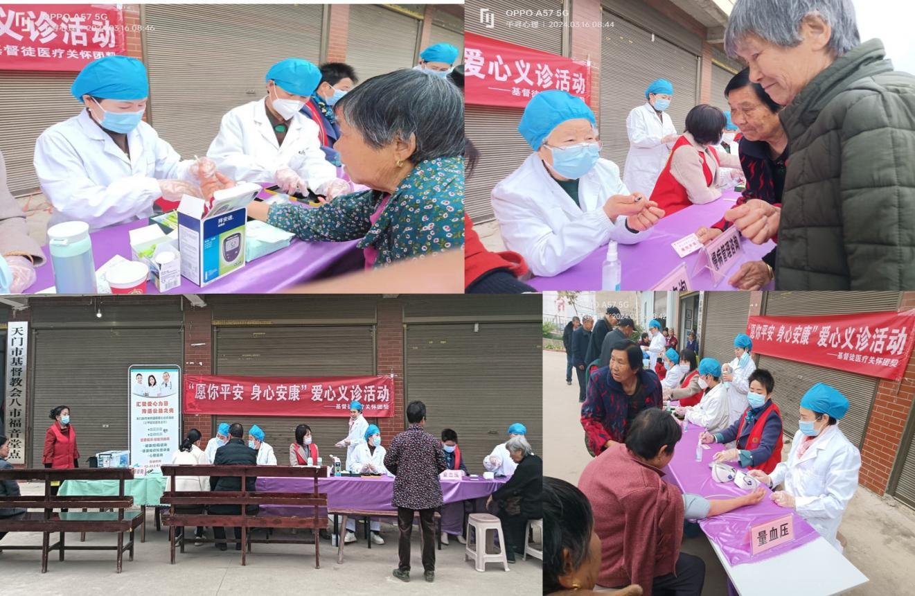 2024年3月16日,天门市基督教两会在杨林街道办事处八市村八市福音堂门前举办“愿你平安 身心安康”基督徒医疗关怀爱心义诊活动。本次活动共为当地群众130人次人士做了健康检测服务。