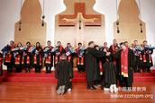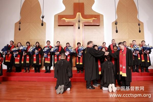 圣职按立礼由王孟坤牧师主礼,陈光旭牧师引荐同工。曲雪芹(女)、候桂佳(女)、赵慧芝(女)、李文强、李炳霞(女)、邵玉莉(女)等6人被按立为牧师,李敏(女)、田爱君(女)、李向荣(女)、马美一(女)、董玉涛、韩瑞友、魏长华、李培学、张银水、秦福军(女)等10人被按立为长老。
