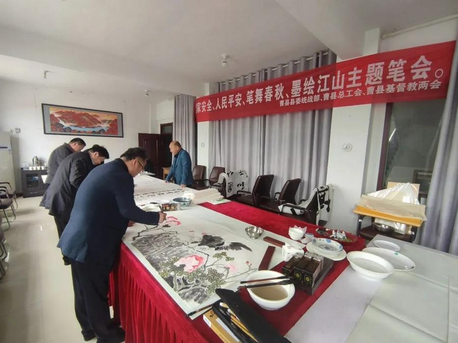4月19日,由山东省基督教两会文化艺术交流专委会、菏泽市基督教两会主办的书画交流会在曹县基督教两会举办,曹州书画院、曹县书画协会,曹县县委统战部、曹县基督教两会以《国家安全人民平安、笔舞春秋墨绘江山》为主题承办。省基督教两会文化艺术交流专委会主任黄斌、专委会副主任、市基督教两会主任会长田素良牧师出席活动,县委统战部副部长管东,县委统战部副部长、县民宗局局长郭继武陪同活动。来自全省各市、县区21位文化艺术家、书画书法家和爱好者,应邀参加了本次活动。