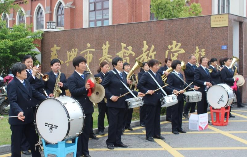 4月23日上午,江苏泰兴市基督教堂呈现着一派喜庆的氛围。教堂大院门口,火红的空飘灯笼球悬浮着,迎宾的弟兄姐妹们分两队站立,一边是乐队,一边是身着正装戴着“耶稣爱你”红色绶带的接待人员;进入院内,拾阶而上,教堂门口的迎宾花篮映入眼帘;步入圣殿,主堂内弟兄姐妹济济一堂,座无虚席。