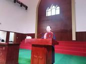 上午10:00,开始了逄先华长老的一堂证道。逄先华长老来到主台讲桌前,在开场白中向大家表示了节日的问候和祝福。然后她以圣经(徒2:1-21)经文为依据,围绕主题“圣灵降临”,用了50多分钟讲了五大部分。