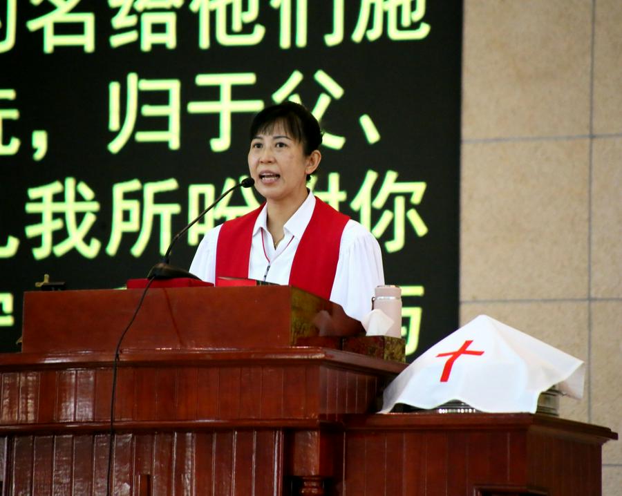 在诗班献诗《受洗归主歌》的圣乐中,鞍山市基督教协会副会长、本堂姜茂牧师登上圣台,问候众信徒在基督里平安、喜乐。她带领会众诵读新约圣经马太福音28章18至20节的经文,以“浅谈洗礼”为题为主题,饱含深情、深入浅出地向大家阐述了接受洗礼的条件、明白洗礼的意义两个方面。之后,姜牧师主持了圣洗礼。