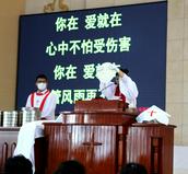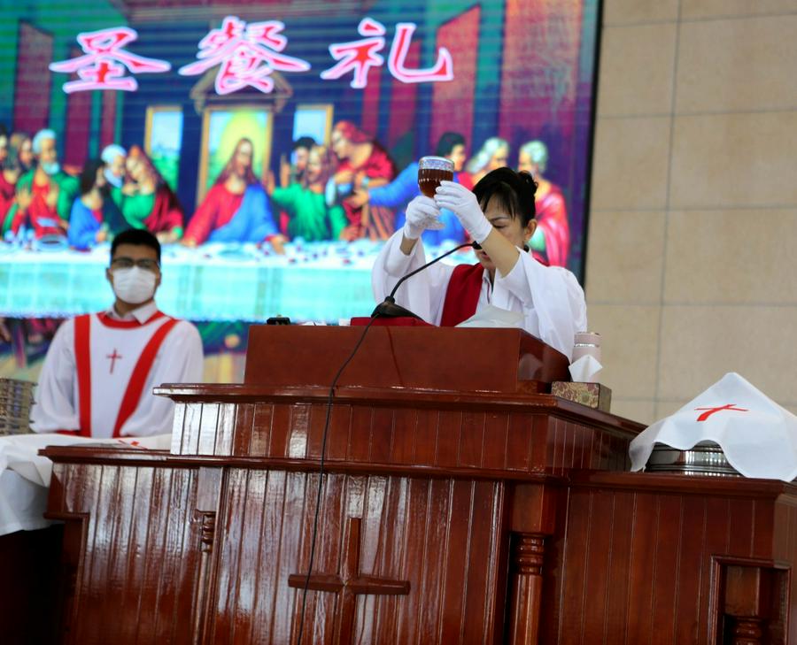 圣洗礼拜之后,姜茂牧师奉主的名带领会众恭读哥林多前书11章26节经文:“你们每逢吃这饼,喝这杯,是表明主的死,直等到他来”,与信众分享为什么要认识主的死,传讲了主的死是舍己救众人,主的死是荣耀天上父的福音。接着她主持了兴盛教会的圣餐礼拜。她高举圣餐奉圣三一真神的名祝圣,众信徒在诗班的赞美声中,低头祷告、省察、反省自己,以诚实、感恩的心接过服事同工派发的圣餐,并在牧师的祷告和带领下服圣餐。