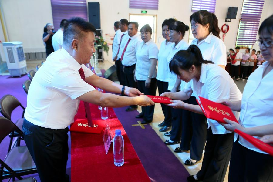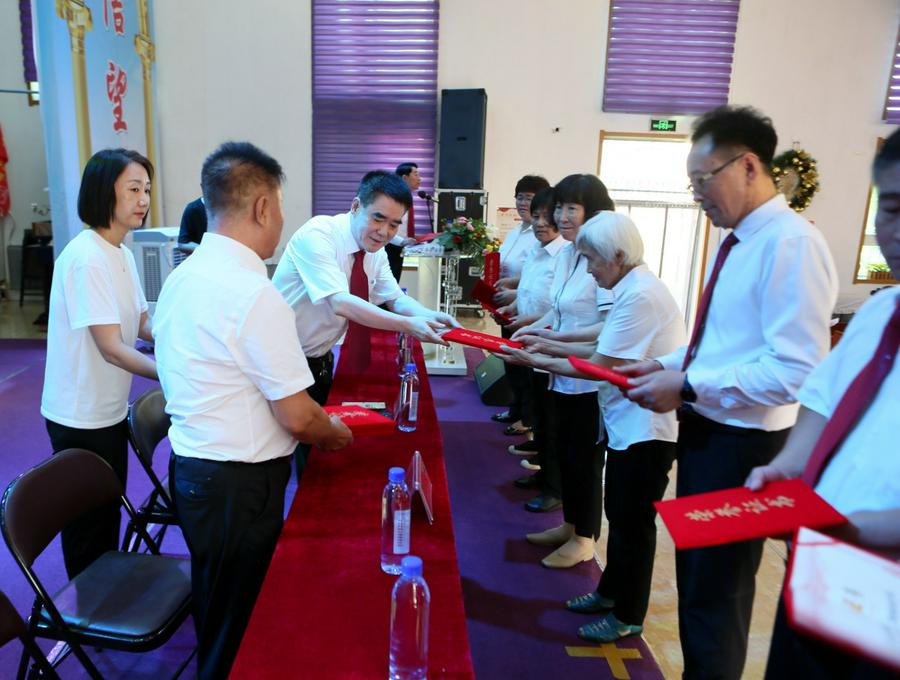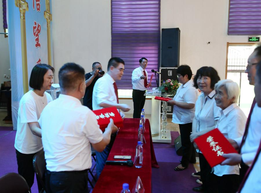 王润涛牧师和万永宝长老莅临颁奖活动,向每一位获奖者和单位代表颁发荣誉证书。各教会来的同工和诗班把一束束鲜花献给获奖者,有的和本教会获奖者相拥而泣,流下感恩的泪。