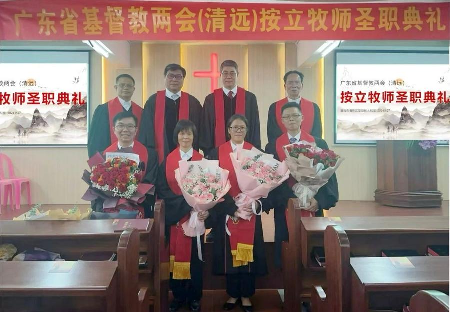 2024年9月27日,广东省基督教两会在清远市清新区基督教太和堂举行了隆重的按立牧师圣职典礼,共按立了胡国鹏、刘国光、林智玲(女)、蔡丽华(女)四位同工为牧师。
