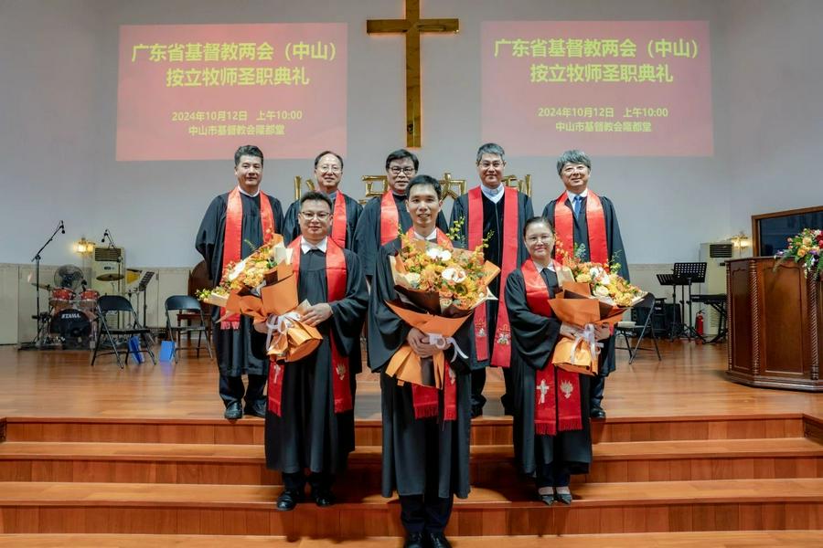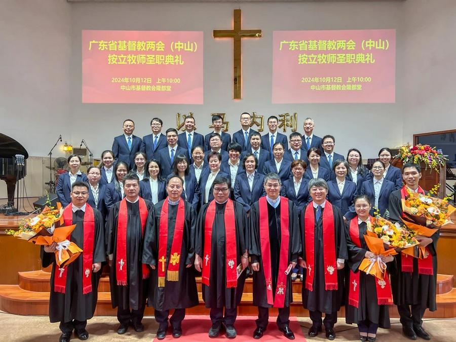 2024 年10月12日上午,广东省基督教两会在中山市基督教会隆都堂隆重举行牧师圣职按立典礼,按立郑惠(女)、郑展超、邓德干三位同工为牧师。此次圣职按立典礼不仅是对三位同工个人信仰与奉献的肯定,也为中山市基督教的发展提供了人才储备,更是对广东省基督教事工发展的有力推动。