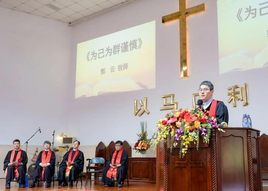 典礼由中山市基督教三自爱国会秘书长鲍敏君牧师主礼,在全体会众高唱《教会根基歌》中拉开帷幕,中山市基督教会全体教职人员献唱《要忠心》,彰显了对信仰的坚定与热忱。郭云牧师引用《使徒行传》20 章 28 节,以“为己为群谨慎”为主题进行深刻分享,激励中山教职人员及即将接受圣职的同工勇担职责使命,与教会同工及信徒携手共建教会。强调依据圣经真理做好信徒教导与牧养工作的同时,在各方面成为信徒榜样,做到自我约束、管理与教育,谦卑侍主,树立楷模。