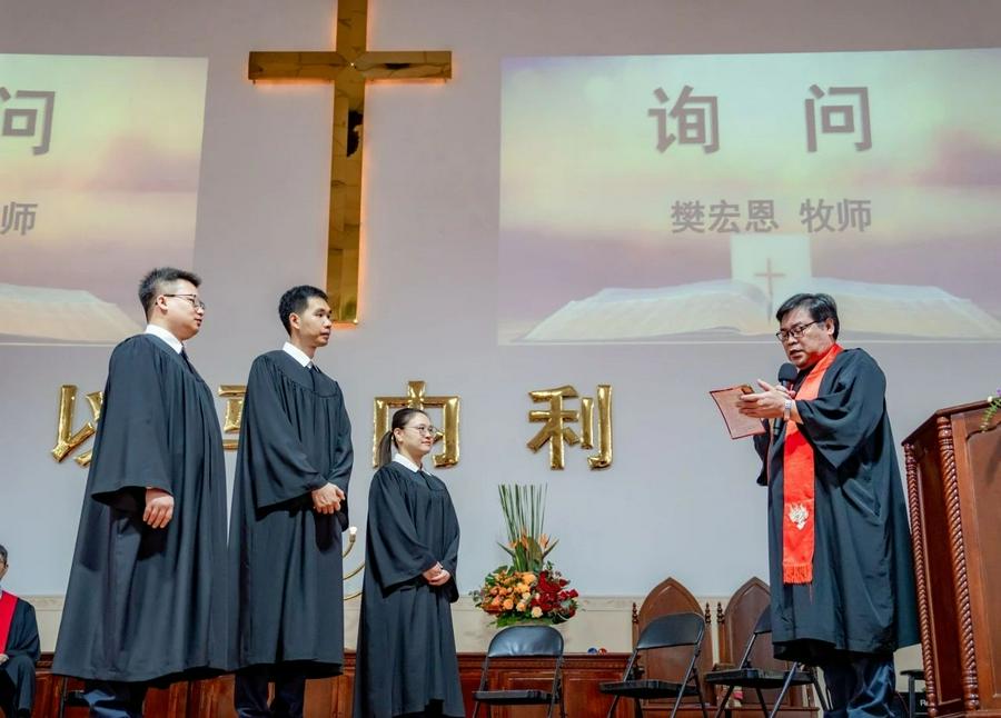 按立典礼由广东省基督教三自爱国会主席樊宏恩牧师、广东省基督教协会会长郭云牧师、广东省基督教协会常务副会长雷玉明牧师、中山市基督教三自爱国会主席王俊牧师、中山市基督教教务委员会会长陈文远牧师组成圣职按立团,中山市基督教会各堂点堂委及约 600 名弟兄姊妹共同参与,中山市民族宗教事务局领导亲临祝贺接受牧师圣职的三位同工。
