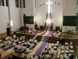 在协和堂内,紫白色的轻纱从十字架上垂落,一直延伸至祷告的人群之中。全体师生以跪坐的姿态面向十字架,寻求神的同在。十字架和金灯台的光辉轻柔洒落,与人群中星星点点的烛光交相辉映,神圣而亲密。