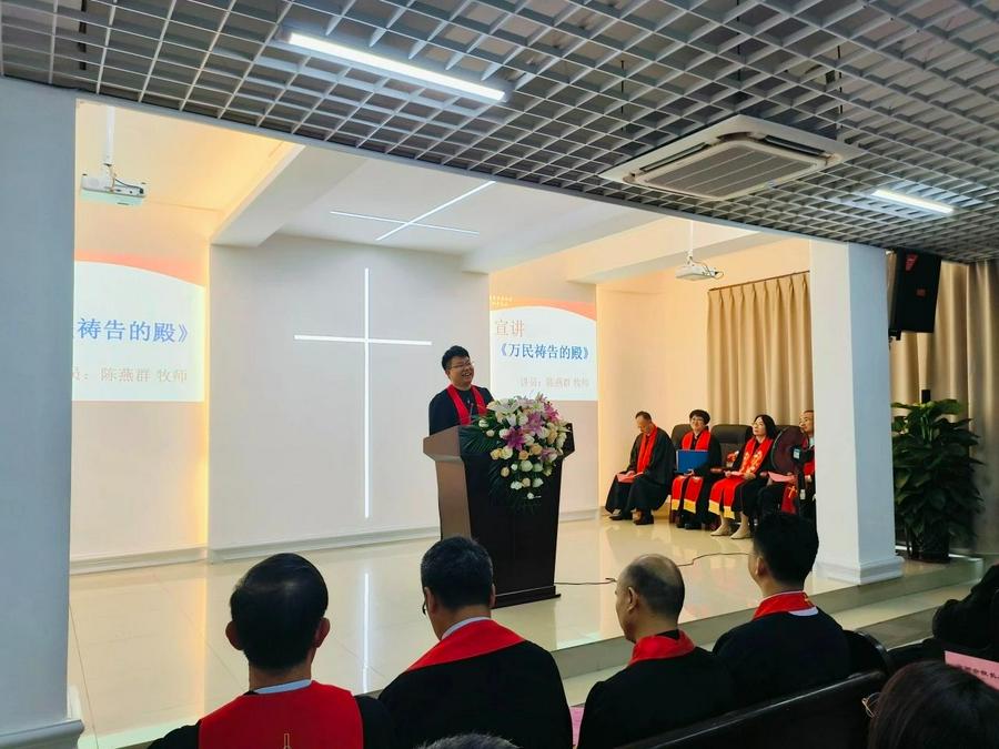 感恩崇拜由沥林堂陶红宁牧师主持,惠州市基督教协会副会长崔二立师祷告,惠州市基督教三自爱国会副秘书长王瑞勤牧师读经,惠州市基督教协会会长、惠城区基督教三自爱国会主席陈燕群牧师引用《以赛亚书》第56章7节,以“万民祷告的殿”为题勉励我们要靠神的引领,在祷告中与神联合,在信仰生活中讨神喜悦。广东省基督教协会副会长雷玉明牧师主持了神圣庄严的祝圣献殿礼仪,献上了祝圣祷文,二十多位牧师一同上台举手为圣殿献上了祝福,感恩崇拜在惠州市基督教三自爱国会副主席沈晓洁牧师的祝福中落下帷幕。